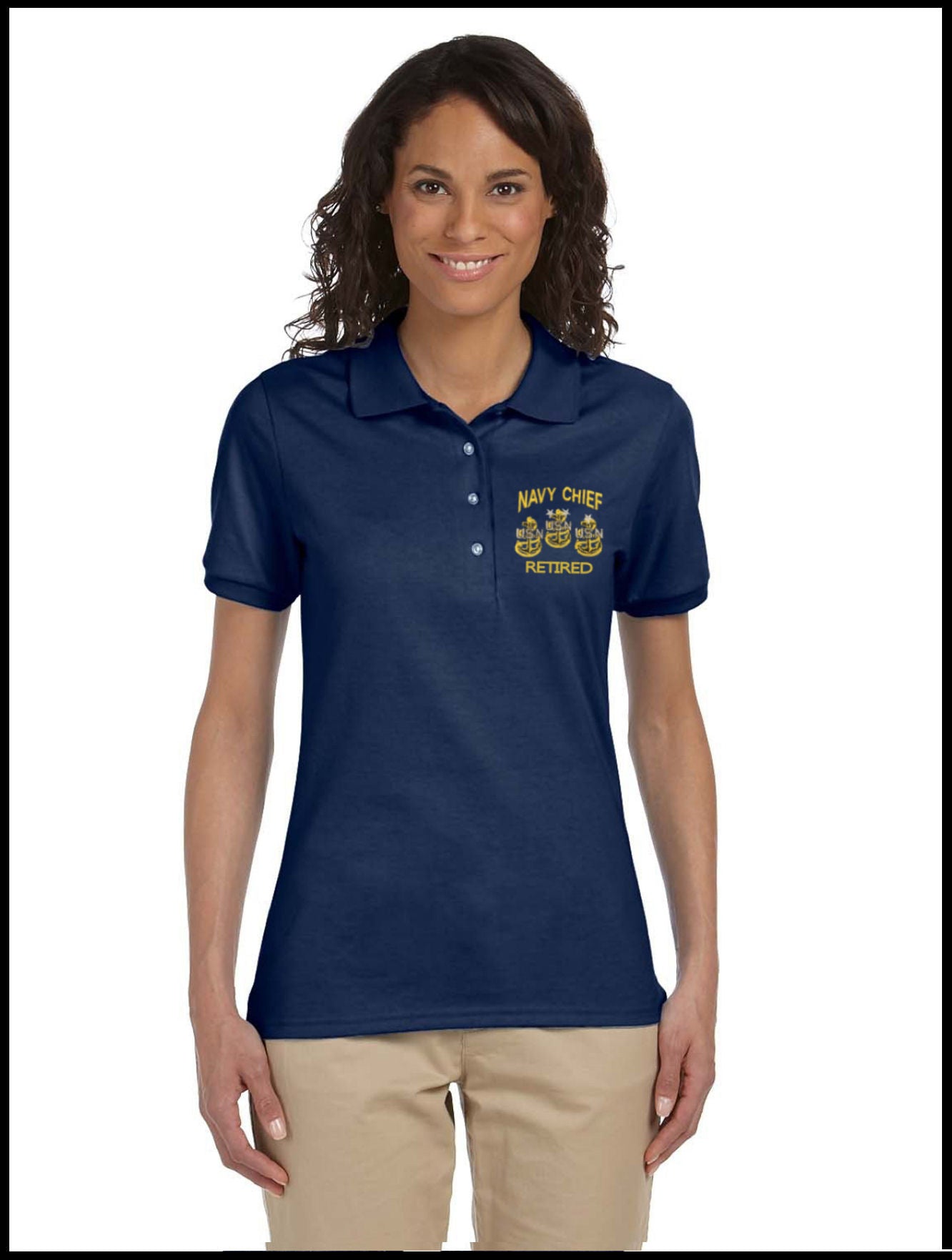Ladies Navy Blue Piqué Polo shirt with Gold Navy Chief Navy Pride Embroidered Logo with all 3 Anchors.