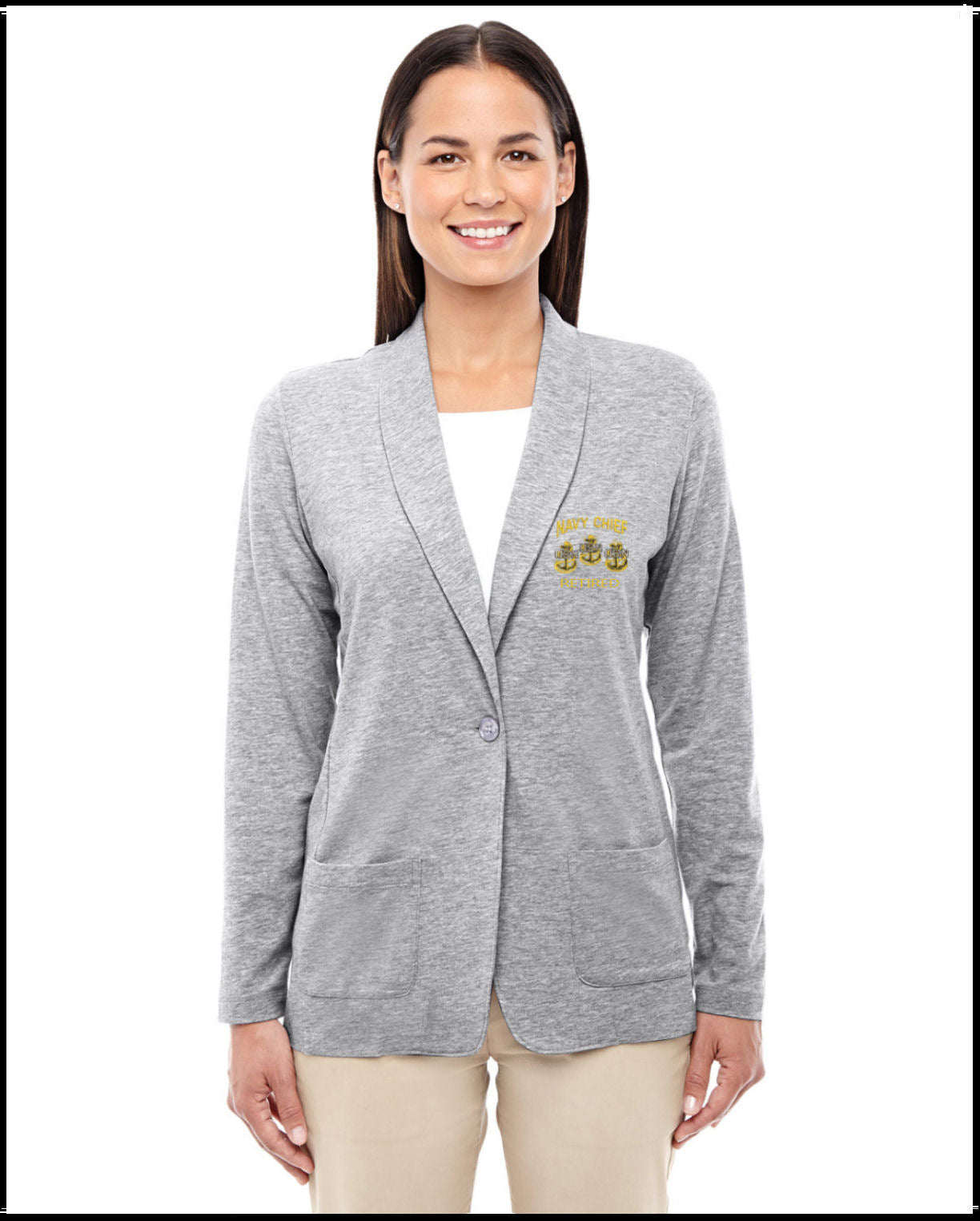 Heather Grey Shawl Collar Cardigan with Gold Navy Chief Retired Embroidered Logo with all 3 Anchors.