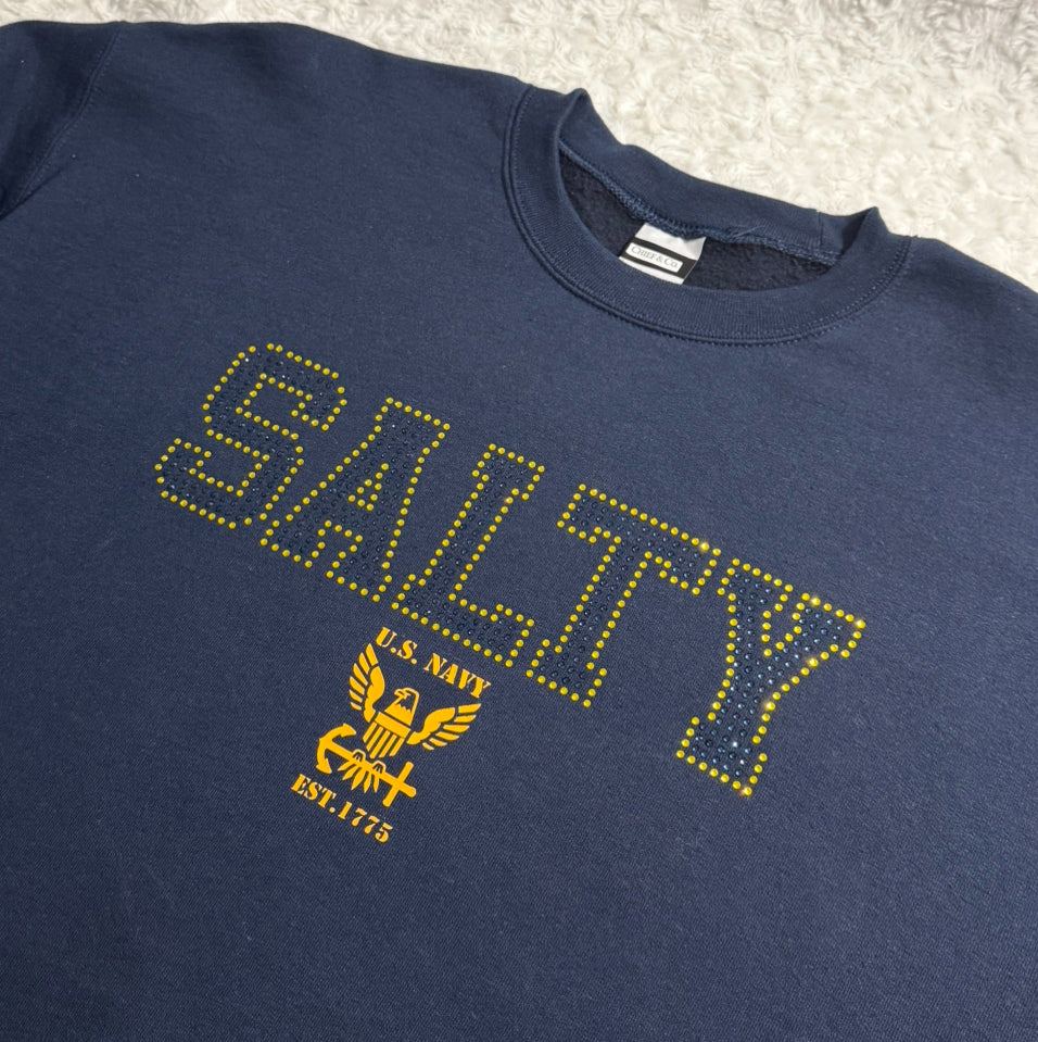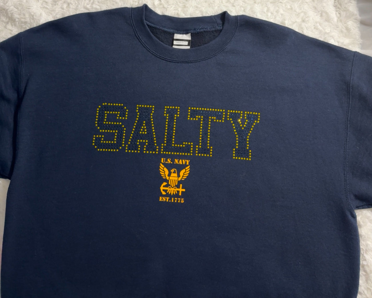 Navy Blue Sweatshirt with Navy Blue and Yellow Rhinestone Design.