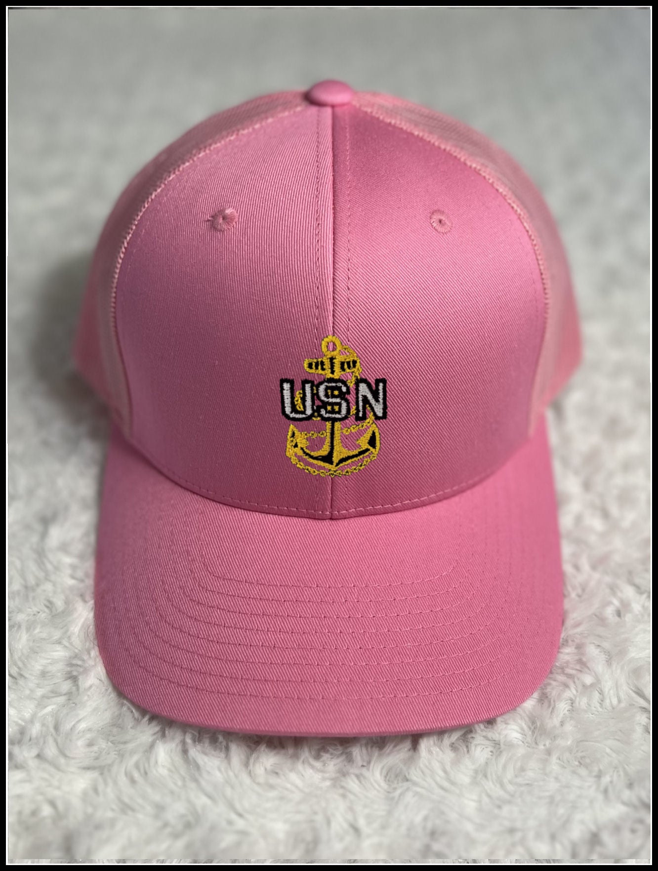 Pink Trucker hat with Gold USN Anchor.